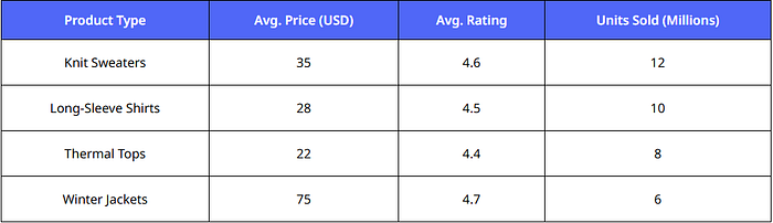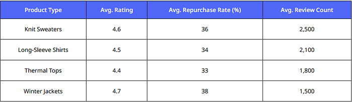 The Amazon winter shirts and tops dataset provides detailed insights on product categories, average prices, and customer ratings, enabling retailers to pinpoint trending SKUs and seasonal favorites. For example, knit sweaters consistently averaged a 4.6-star rating, long-sleeve shirts held 4.5, and thermal tops 4.4. By analyzing these metrics, businesses can prioritize stock of high-performing products and reduce underperforming items, optimizing revenue.