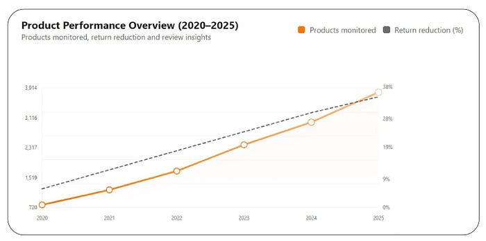 - 2025*: 3,800 products, 4.6 rating, 500 insights, 35% reduction